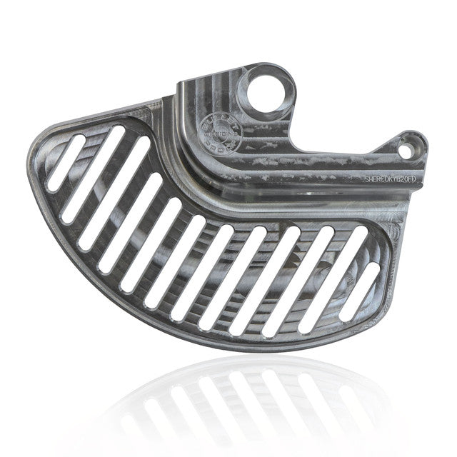 The ultimate protection for the front end of your Sherco. These front disc guards are specifically built for the Sherco factory edition models with the KYB Front Forks. Our Sherco Front Disc Guard protects the front brake rotor against rocks and heavy impacts. This product also protects the lower fork lug while still allowing for compression or rebound fork adjustments to take place through the access hole on the bottom of the guard. This simple installation takes less than 5 minutes and requires no specials tools to complete. This product works in conjunction with our all new fork lug guard for the RH fork leg.